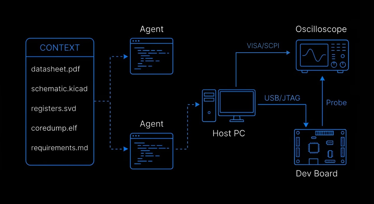 Compile, flash, and debug on real systems. The agent connects to serial monitors, debuggers, and test equipment to iterate until the code runs clean.